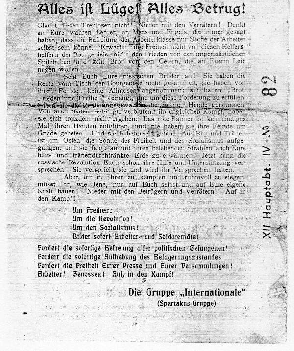 Erläuterung: Dieses Flugblatt wurde am 8.November durch den Spartakusbund gedruckt und verbreitet. Es sollte die Leitlinien und Forderungen für den Streik und die Demonstrationen am folgenden Tag vorgeben. |