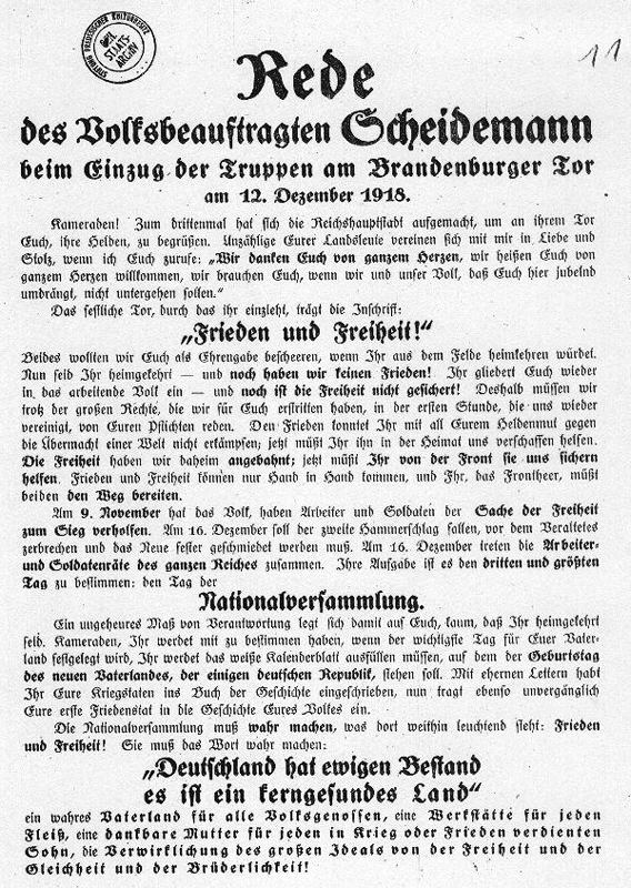 Erläuterung: Am 12.Dezember hielt schließlich Scheidemann am Brandenburger Tor, nach Ebert, Haase und Wels an den Vortagen, die Begrüßungsrede für den 3.Teil der in Berlin eingezogenen Fronttruppen. Er stellt in seiner Rede die Wichtigkeit der Nationalversammlung heraus, die für ihn den Weg zu "Frieden und Freiheit" ebnet. Die Parallele, die er in seinem letzten Satz zur französischen Revolution zieht, ist, wenn man die Ereignisse in den nächsten Wochen betrachtet, schon fast zynisch: schließlich wurden 1789 die Reaktionäre und nicht die Revolutionäre ermordet. |