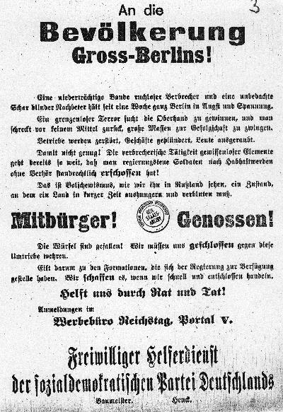 Erläuterung: Um während des Spartakusaufstandes hart gegen die Revolutionäre durchgreifen zu können, stellte die SPD in Eigeninitiative Freikorps auf um ihre militärische Schlagkraft zu verstärken. Die Größe der Reichswehr war auf Grund der Waffenstillstandsbedingungen auf 100.000 Soldaten begrenzt, da aber die Freikorps nicht wie die Reichswehr unter dem Befehl der Regierung standen, sondern nur ihren Führern verpflichtet waren, wurden sie nicht zu den 100.000 Mann dazugezählt, was für die politischen Gegner die Möglichkeit bot, sich eigene, treudienende Truppenverbände aufzustellen, die von keiner offiziellen Seite kontrolliert wurden Auch im Falle der Rekrutierung zog die SPD wieder das Propagandabild des verwahrlosten, bolschewistischen Rußlands heran - solche Zustände müssten in Deutschland um jeden Preis verhindert werden. Aus dem durch Großindustrielle finanzierten "Freiwillegen Helferdienst der SPD" ging das nationalistisch-konservative "Regiment Reichstag" hervor. |