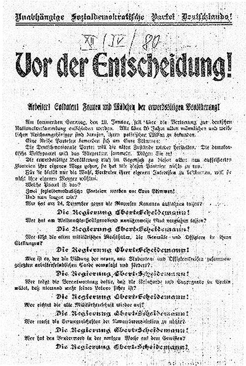 Erläuterung: Der Wahlaufruf der USPD im Vorfeld der Wahlen zur Nationalversammlung am 19.Januar 1919 war auf Grund der Weihnachtsunruhen, des Spartakusaufstandes und der Morde an Liebknecht und Luxemburg auf eine offene Konfrontation mit der Ebert-Scheidemann-Regierung und deren Verrat an den sozialistischen Revolutionären ausgerichtet. Jedoch hatte die Kampagne nicht viel Erfolg - die USPD erhielt nur 7,6% der Stimmen, die SPD dagegen 37,9%. |