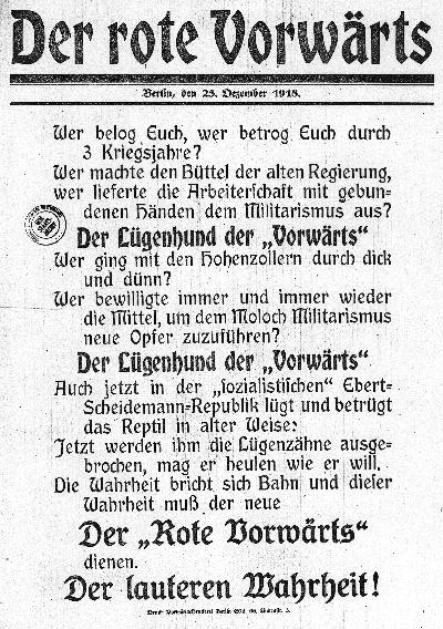 Erläuterung: Der "Vorwärts" war während des 1.Weltkrieges in seiner Funktion als zentrales Parteiorgan der SPD für die Revolutionäre in Deutschland zum Sinnbild der arbeiterfeindlichen Politik der SPD geworden, durch den stets der Durchhaltewille im vermeindlichen Verteidigungskrieg proklamiert wurde. Dementsprechend stark richtete sich die Wut der Revolutionäre, bedingt durch die Zusammenarbeit der Ebert-Scheidemann-Regierung mit der Reaktion, körperlich gegen das Vorwärts-Verlagshaus - hier hatte man einen direkt angreifbaren Feind, den man mit Waffen erobern konnte und so wurde das Gebäude in der Lindenstraße zu einem der meist umkämpften während der Berliner Novemberrevolution. |