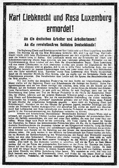 Erläuterung: Dieses Flugblatt stellt einen Nachruf an Rosa Luxemburg und Karl Liebknecht dar, die in der Nacht vom 15. auf den 16.Januar 1919 von Soldaten der Gardekavallerieschützendivision ermordet wurden. Schon am Tag nach ihrem Tod begannen die Spekulationen um die Umstände der Tat, die bis zum heutigen Tag andauern. Existierte ein Befehl von Noske? Wußten Ebert und Scheidemann von dem Mordkomplott? Wer waren die Geldgeber, die das Kopfgeld auf die beiden aussetzten? |