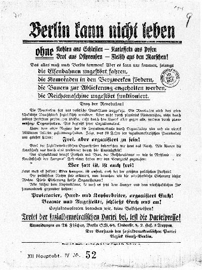 Erläuterung: Die SPD nutzte die wirtschaftlich schlechte Situation als Folge des 1.Weltkrieges und die damit verbundene Angst der Menschen in Deutschland vor einem weiteren Kohlrübenwinter immer wieder aus um auf die Gefahren des Kommunismus hinzuweisen. Allein durch Organisation im Sinne eines Beitritts zur SPD sollte man sich vor Hunger schützen können. Deutlich kann man diesem Flugblatt auch Stimmungsmache gegen die abgespaltene USPD entnehmen. |